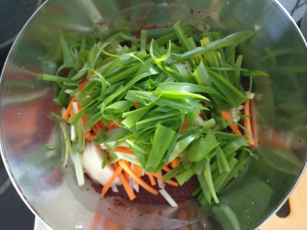 4. Kun puuro on täysin jäähtynyt, lisää siihen raastettu valkosipuli, keltasipuli ja inkivääri sekä kalakastike ja hienonnetut suolatut katkaravut. Sekoita lusikalla, kunnes seos on tasaista ja ohutta tahnaa. Lisää punapippurihiutaleet ja sekoita tasaiseksi. Lisää esivalmistellut kasvikset ja sekoita. Kimchin maustetahna on valmis.