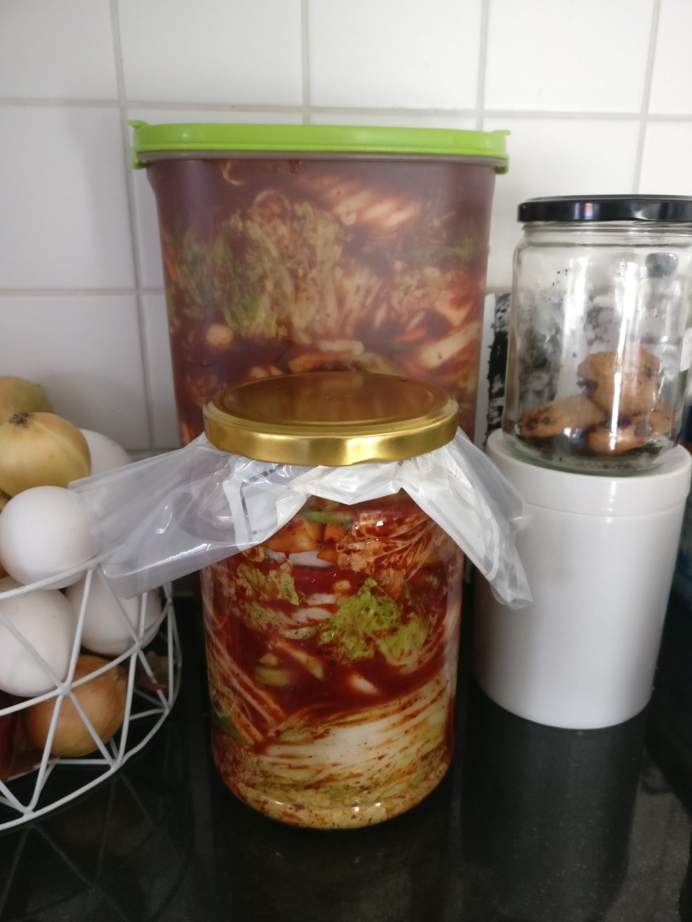 .6. Anna fermentoitua huoneenlämmössä 2-3 päivää, kunnes kimchi alkaa kuplia ja haju muuttuu maitohappokäymisen myötä raikkaaksi. Säilytä sen jälkeen jääkaapissa, kimchi on parasta jääkaappikylmänä.
