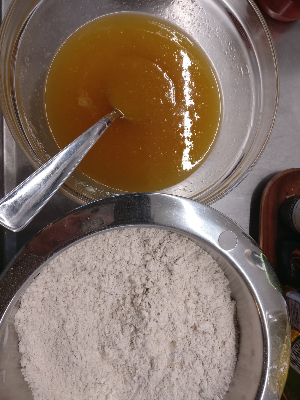 1. Mittaa mikronkestävään astiaan hunaja, sokeri ja rasvat. Mikroa täydellä teholla 1 min kerrallaan, kunnes rasva on sulanut. Sekoita tasaiseksi ja jätä odottamaan.