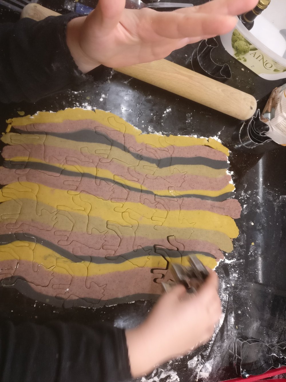 Värjäsin tällä kertaa taikinan nejään eri väriin ja askartelimme lasten kanssa erilaisia pipareita.