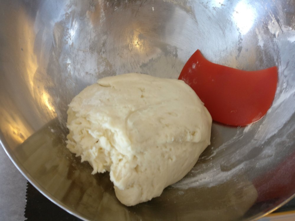 2.Tee jauhoseos ja sekoita tasaiseksi. Lisää sen päälle kädenlämpöinen sitkoliemi ja vaivaa sähkövatkaimen taikinakoukuilla tasaiseksi. Lisää jälkisitkon ainekset ja sekoita tasaiseksi. Anna levätä 10min kylmässä.