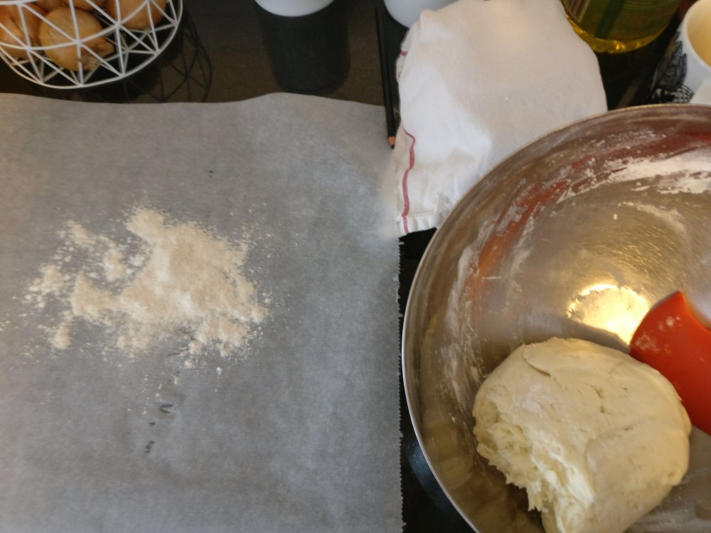 3. Ripottele leivinpaperin päälle durrajauhot, kaavi taikina päälle ja kauli leivinpaperiarkin kokoiseksi. Siirrä leivinpaperin kanssa uunipellille ja pistä pakastimeen/pakkaseen 15minuutiksi. Siivoa sillä aikaa keittiö ja höylää maidoton margariini lautaselle, laita margariinilautanen jääkaappiin.