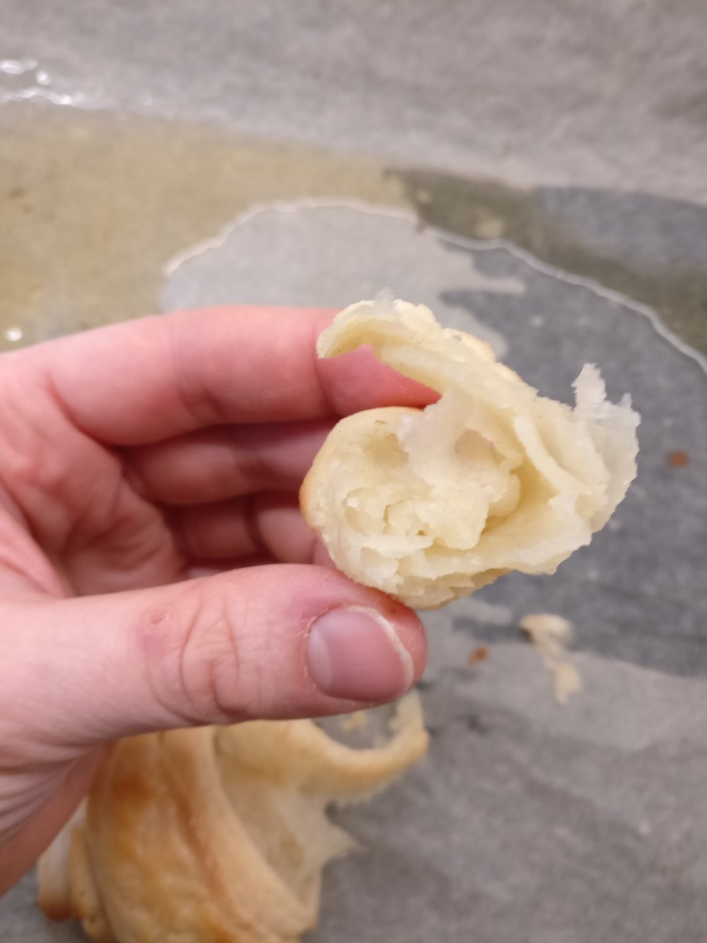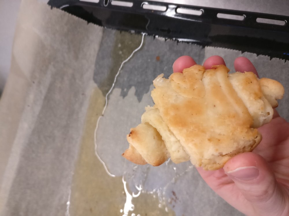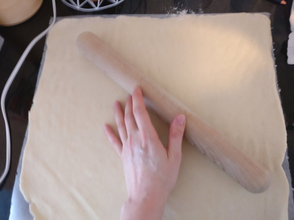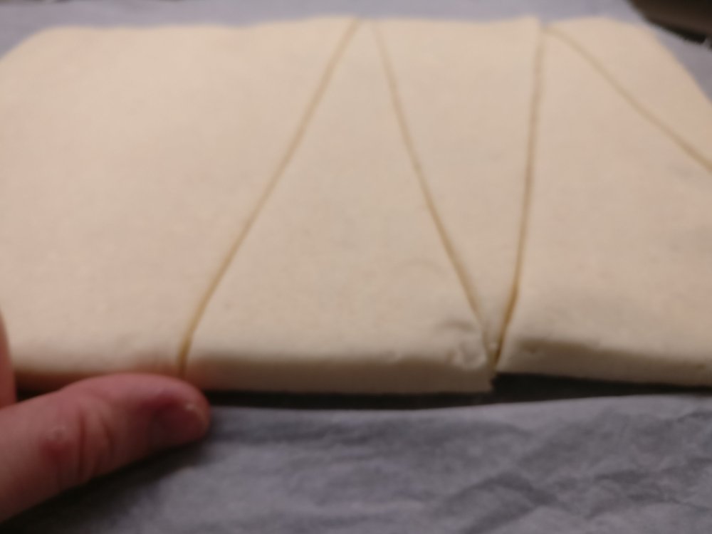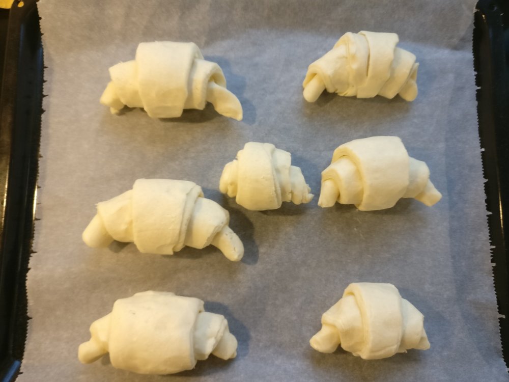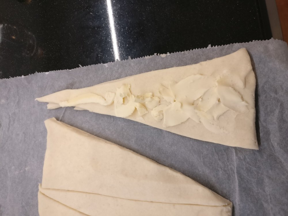 7. Muotoile haluamallasi tavalla, itse tein tällä kertaa croissantteja, joten ohje jatkuu croissantin teko-ohjeena: leikkaa 7 kolmiota taikinasta. Kaulitse jokaista kolmiota vähän pidemmäksi ja ohuemmaksi. Höylää maidottomasta margariinista (n.50g yhteensä) ohuita viipaleita ja asettele kolmion päälle. Kääri rullalle ja nosta leivinpaperin päälle uunipellille. Vie kylmään 30 minuutiksi.
