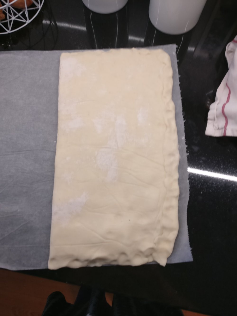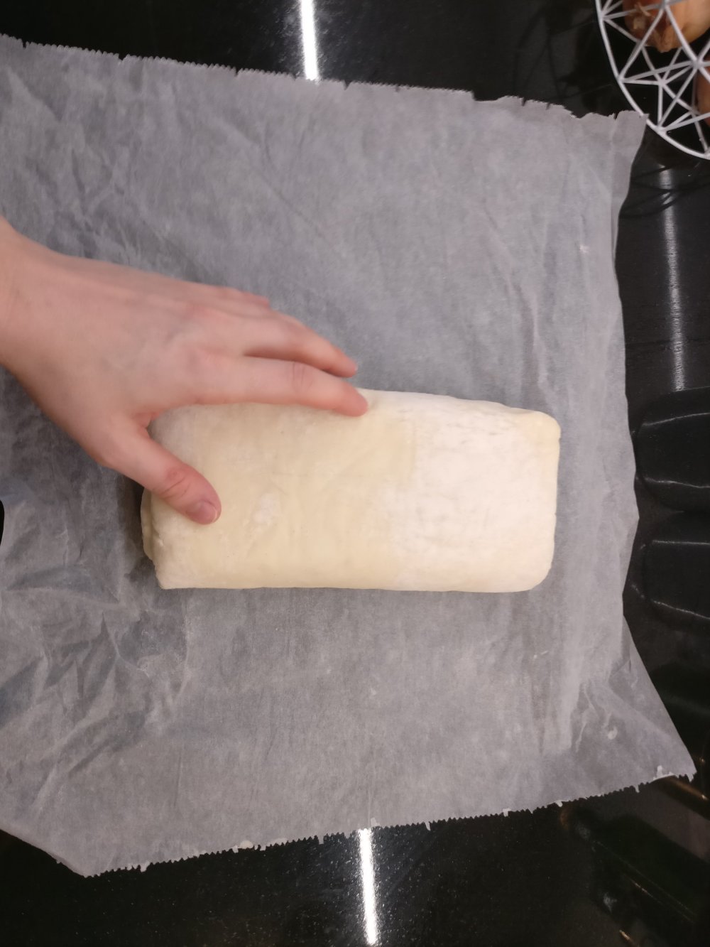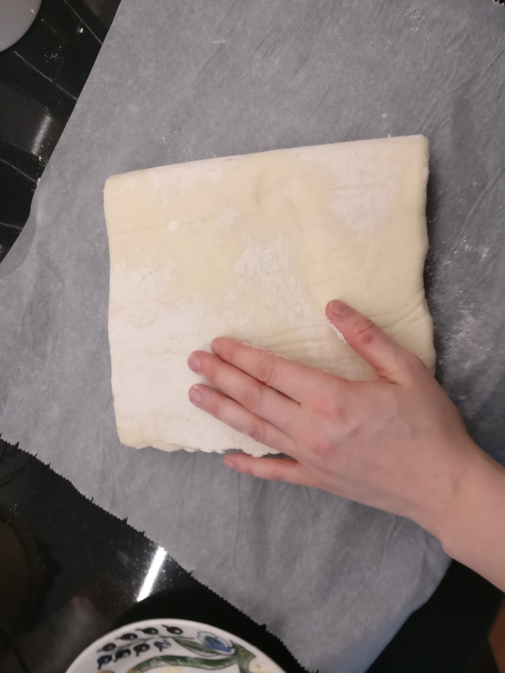 4. Ota taikina ulkoa sisään, levitä toiselle puolelle levyä höylätty margariini ja taita leivinpaperin avulla toinen puoli taikinaa päälle. Levitä loppu margariini ja taita taas taikinalevy sen päälle. Tasaa reunat käsin painellen ja taita levyn reunat keskelle.
