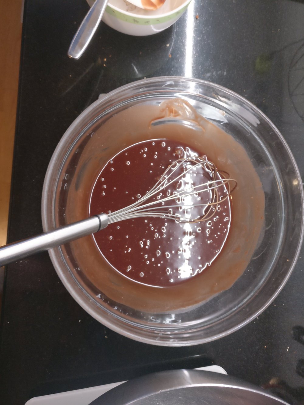 1. Mittaa ainekset mikronkestävään kulhoon ja lämmitä 1000W 10 sekunnin pätkissä, kunnes suklaa on sulanut.