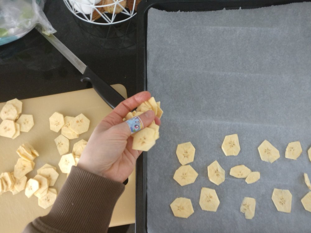 Ensin keittobanaanit kuoritaan terävällä veitsellä, viipaloidaan mahdollisimman ohuiksi viipaleiksi ja levitetään uunipellille leivinpaperin päälle.