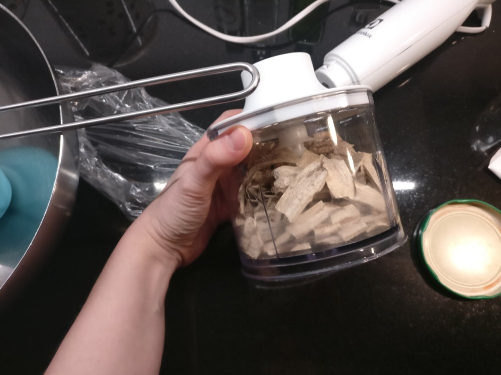 Jauhoin rutikuivat banaaniviipaleet seuraavana iltana jauhoksi. Tiheäsilmäisen siivilän kanssa siivilöin ja palautin isommat palat takaisin jauhantakulhoon.