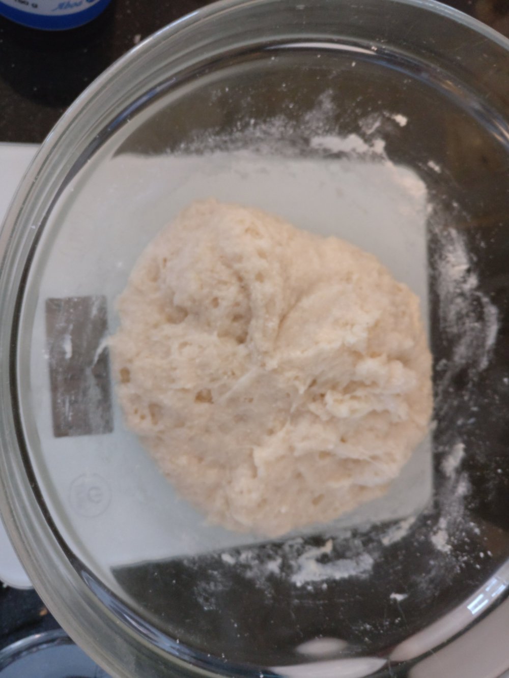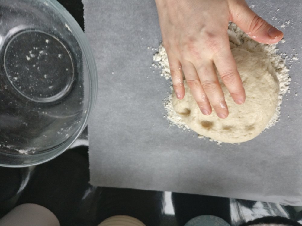 3. Ota valmistamastasi jauhoseoksesta 11/2dl (80g) pieneen kulhoon ja lisää siihen leivinjauhe, sekoita siivilällä tasaiseksi. Ota taikina jääkaapista, kaada päälle jääkylmä vesi ja jauho-leivinjauheseos. Kääntele nuolijan avulla taikina tasaiseksi.