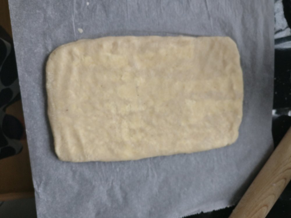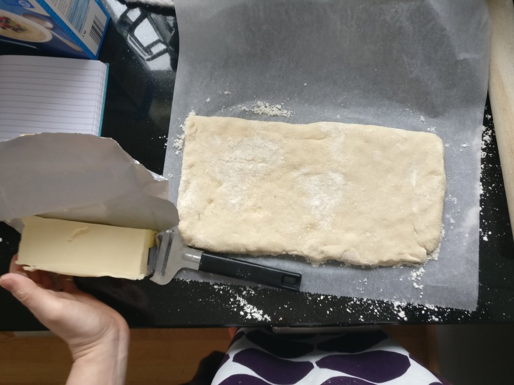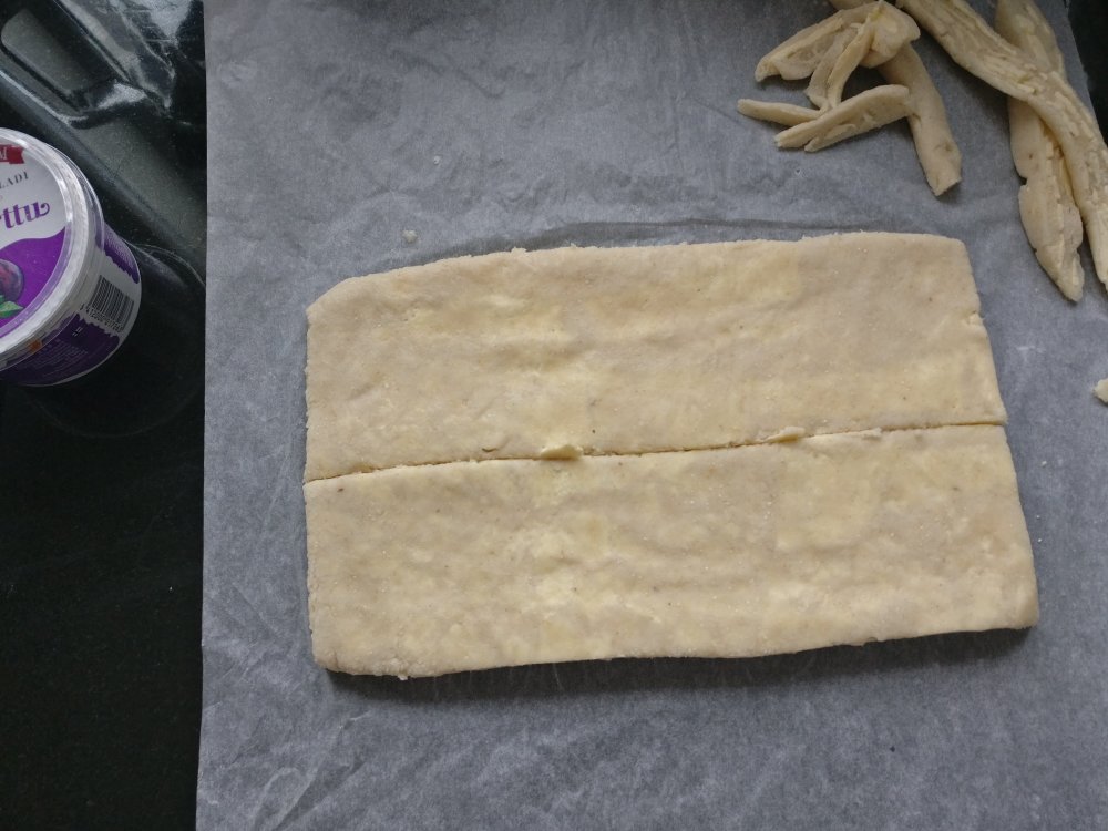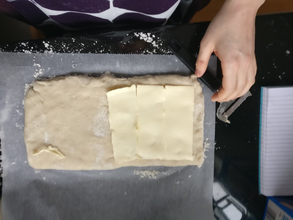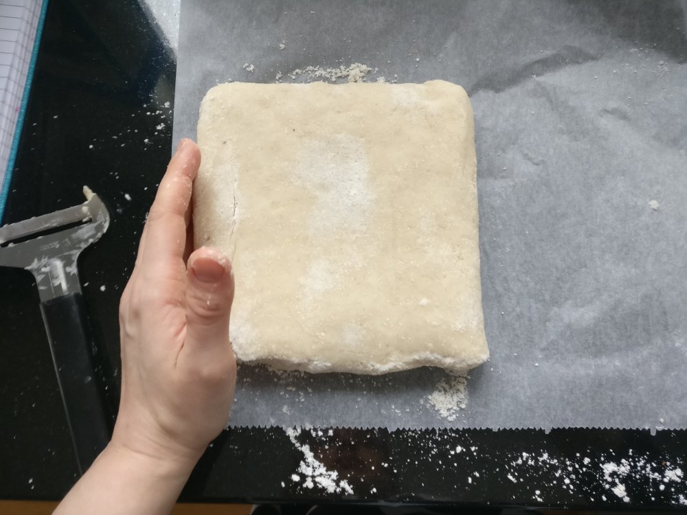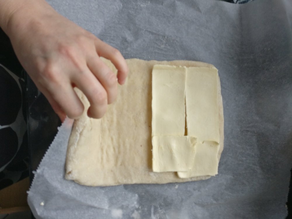 4. Ripottele puolet lopusta jauhoseoksesta leivinpaperin päälle, nosta taikina sen päälle ja ripottele loput jauhot päälle. Taputtele ja sitten kauli varovasti suorakaiteen muotoiseksi. Höylää kylmää margariinia niin paljon, että toinen puoli taikinasta peittyy. Taita toinen taikinapuolisko päälle ja ummista reunat. Höylää taas margariinia niin, että puolet taikinasta peittyy ja käännä leivinpaperin avulla taikina päälle. Kauli varovasti palasta matalammaksi ja höylää taas margariinia niin, että puolet taikinasta peittyy. Taita toinen puoli päälle ja kauli taikina n.16×30 cm kokoiseksi ja vie kylmään lepäämään.