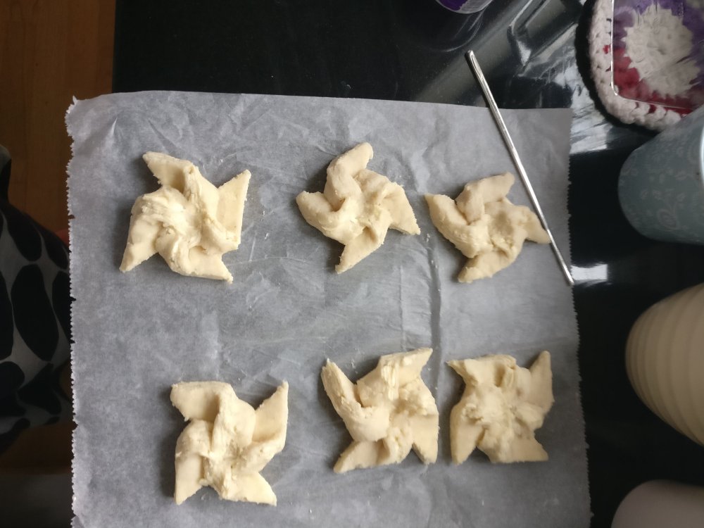 (6-8kpl tähtitorttuja- aktiivinen aika 1h -passiivinen aika 4h – uuni +200kiertoilma/+225C tavallinen uuni- paistoaika 15-20min)