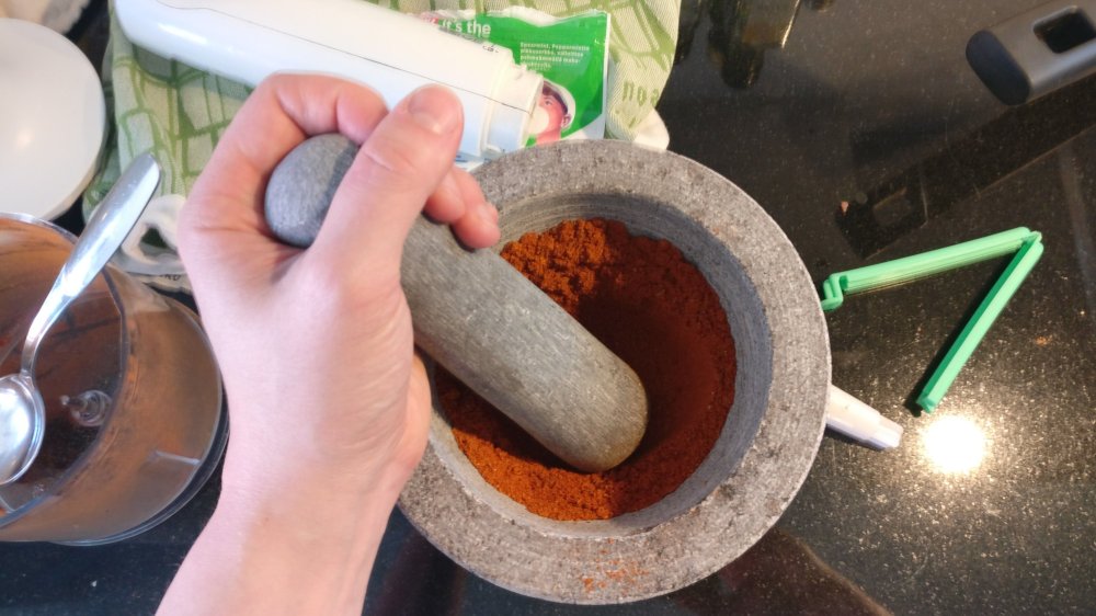 1. Paahda kokonaiset mausteet pannulla. Kaada mortteliin ja murskaa hienoksi.