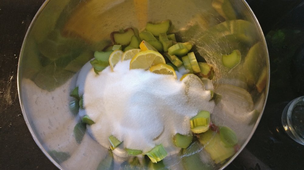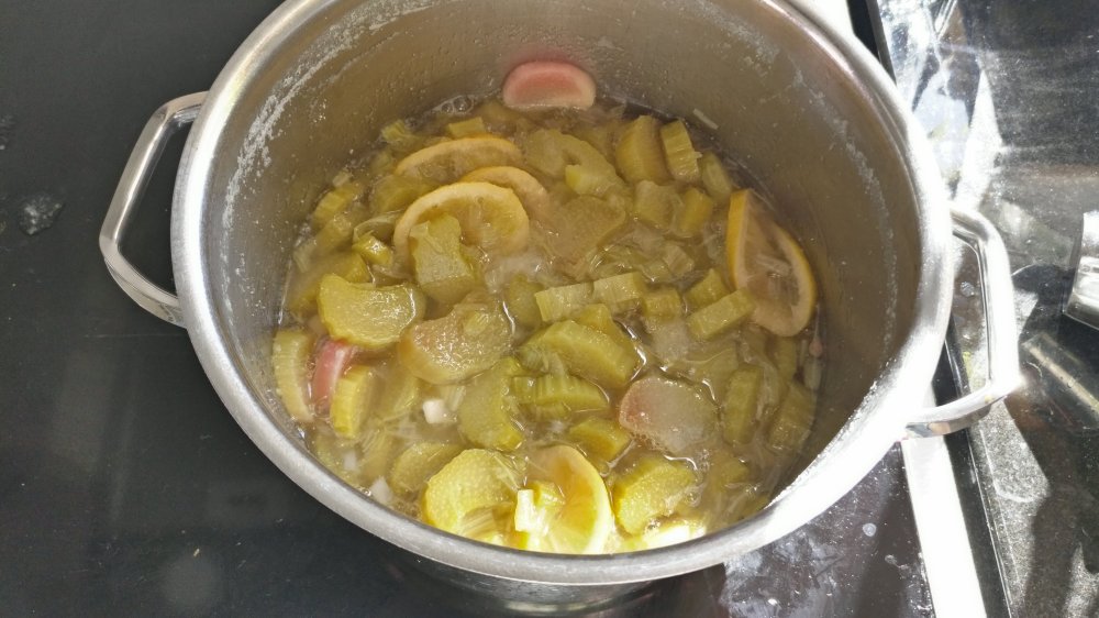 1. Mittaa kattilaan raparperi, sokeri ja 1 l vettä. Keitä 10min ja ota pois hellalta.