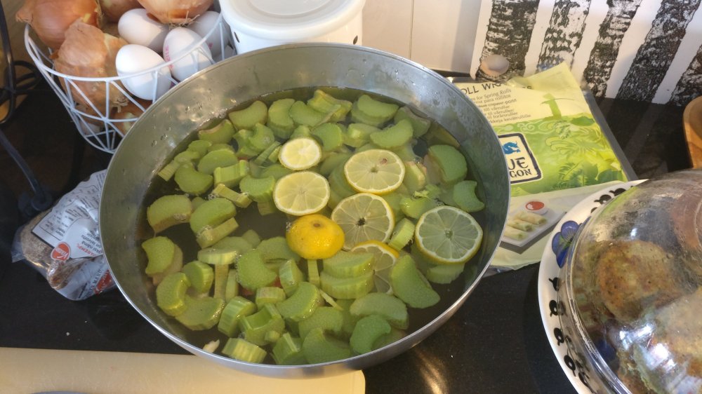 Sain mummolasta kolme isoa vartta raparperiä, yhteensä 700 g. Päädyin nopeimpiin mahdollisiin resepteihin eli raparperisimaan, raparperimehuun ja niiden ylijäämästä syntyvään raparperi-sitruunahilloon.
