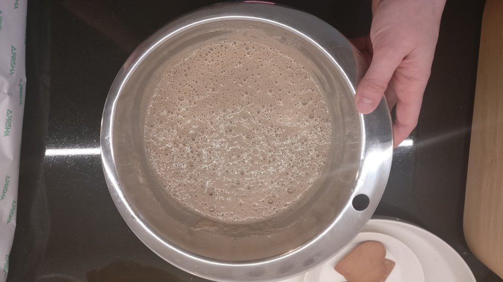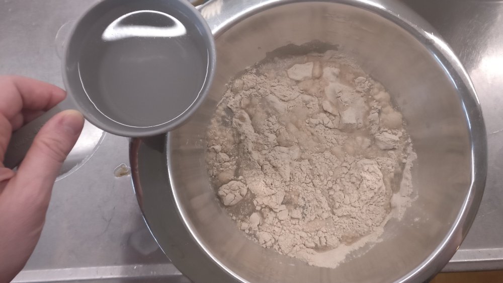 1. Mittaa jauhot leivinkulhoon, mittaa vesi päälle ja sekoita lusikalla. Peitä leivinliinalla ja anna seistä huoneenlämmössä 3 vrk ajan. Tarkista päivittäin, jos seos uhkaa kuivua, lisää vettä.