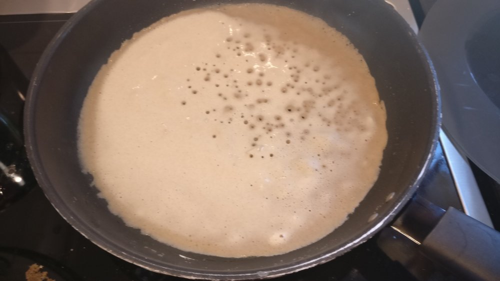 3. Paista ohuita lettuja kuumalla paistinpannulla niin, että letun pinnalle nousseet ilmakuplat hyytyvät. Peitä paistinpannu kannella, sammuta lämpö pannun alta ja anna kypsyä kannen alla pari minuuttia, kunnes lettu on kypsä. Kaada isolle lautaselle (älä yritä nostaa lastalla, valmis lettu repeää herkästi).
