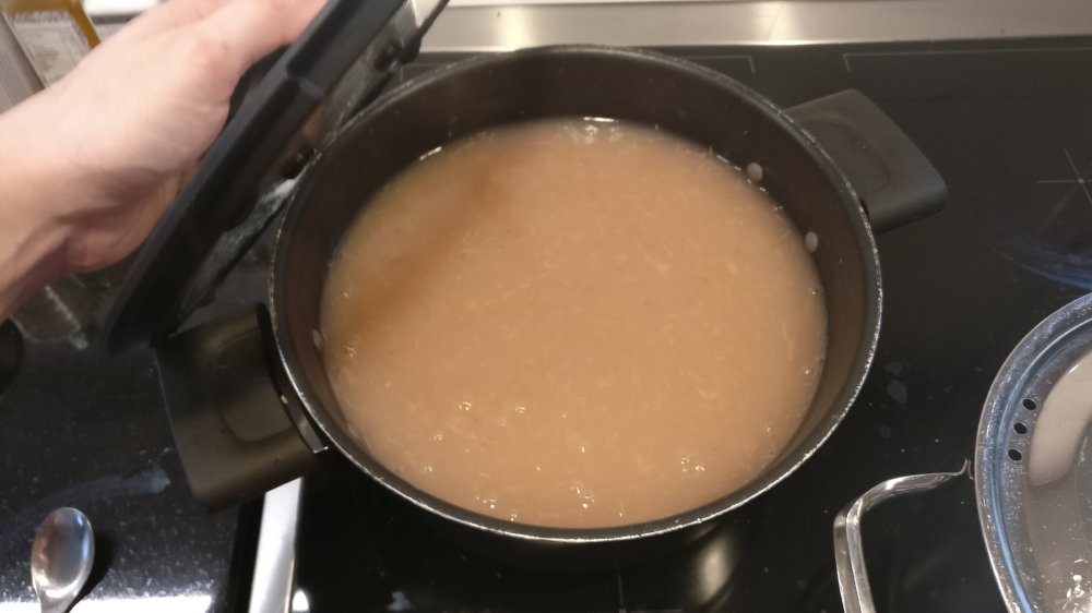 1. Pese omenat ja lohko ne suoraan kattilaan. Lisää vettä niin paljon, että omenat peittyvät. Keitä kunnes lohkot alkavat hajota eli n. 20min.