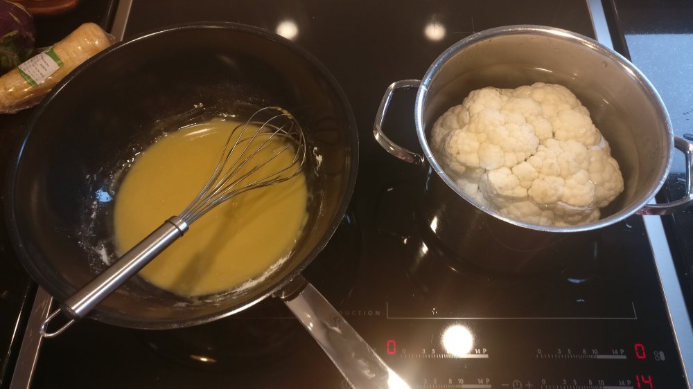3. Kukkakaalin kuumetessa valmista vakokastike. Kaada öljy paistinpannuun ja lisää jauhot. Kuumenna, niin että seos alkaa kuplia. Lisää soijamaito jatkuvasti vispaten sekaan.