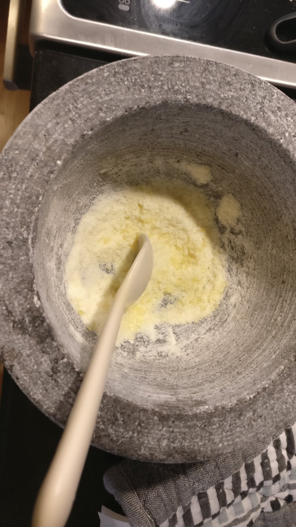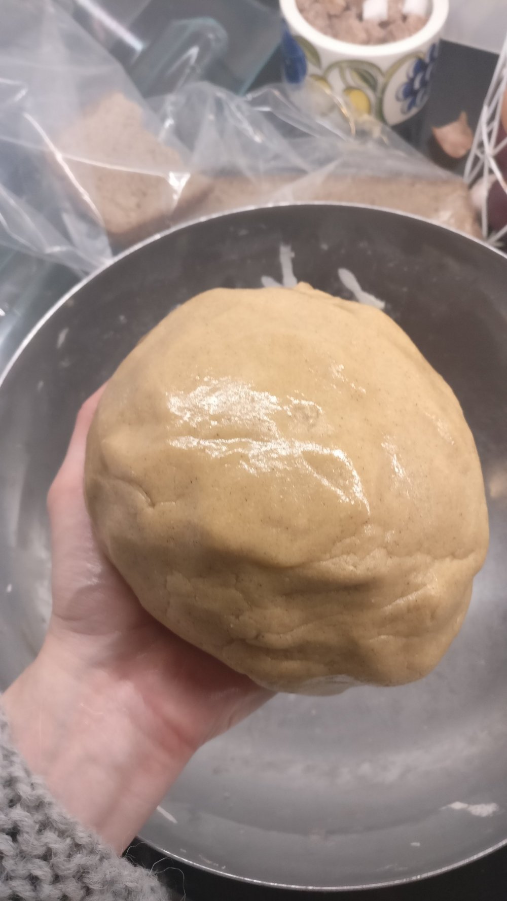 3. Sekoita vielä kuuma rasvasokeriseos jauhoihin. Alusta n.5min ajan, muotoile palloksi ja siirrä kylmään yön yli lepäämään.