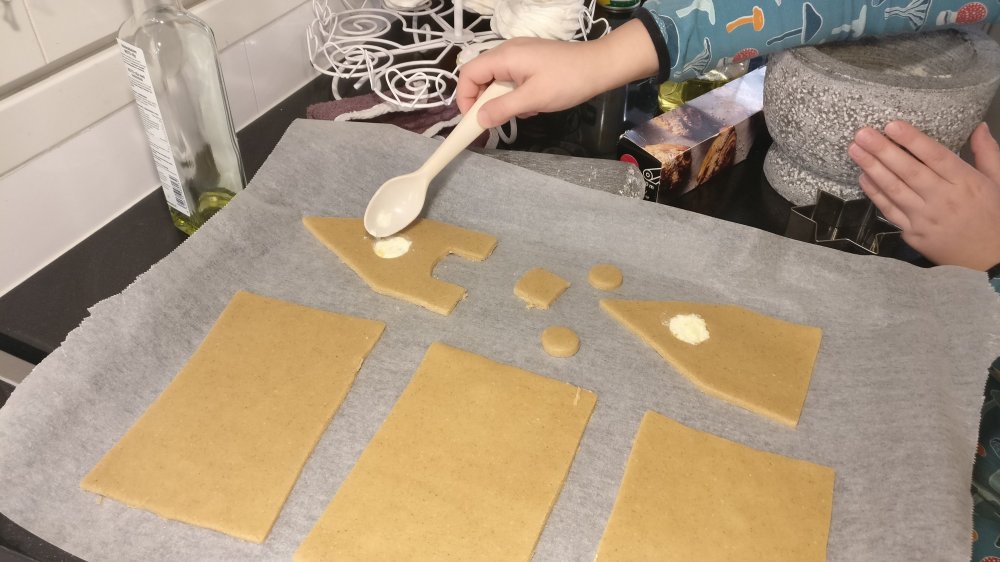 (Maidoton, munaton, gluteeniton, soijaton)(2 pientä piparkakkumökkiä ja pellillinen tähtipipareita – aktiivinen aika 2 h – passiivinen aika 12h – uuni +200C kiertoilmauuni/+225C tavallinen uuni – paistoaika n.6min pikkupiparit n.9 min piparitalon osat)