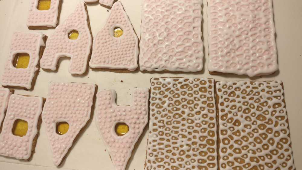 6.Jos haluat lasi-ikkunat, murskaa 8 keltaista muumitikkaria hienoksi, nosta n.2tl ikkunaa kohti ja tasoita. Paista ja anna jäähtyä täysin ennen siirtämistä pelliltä.