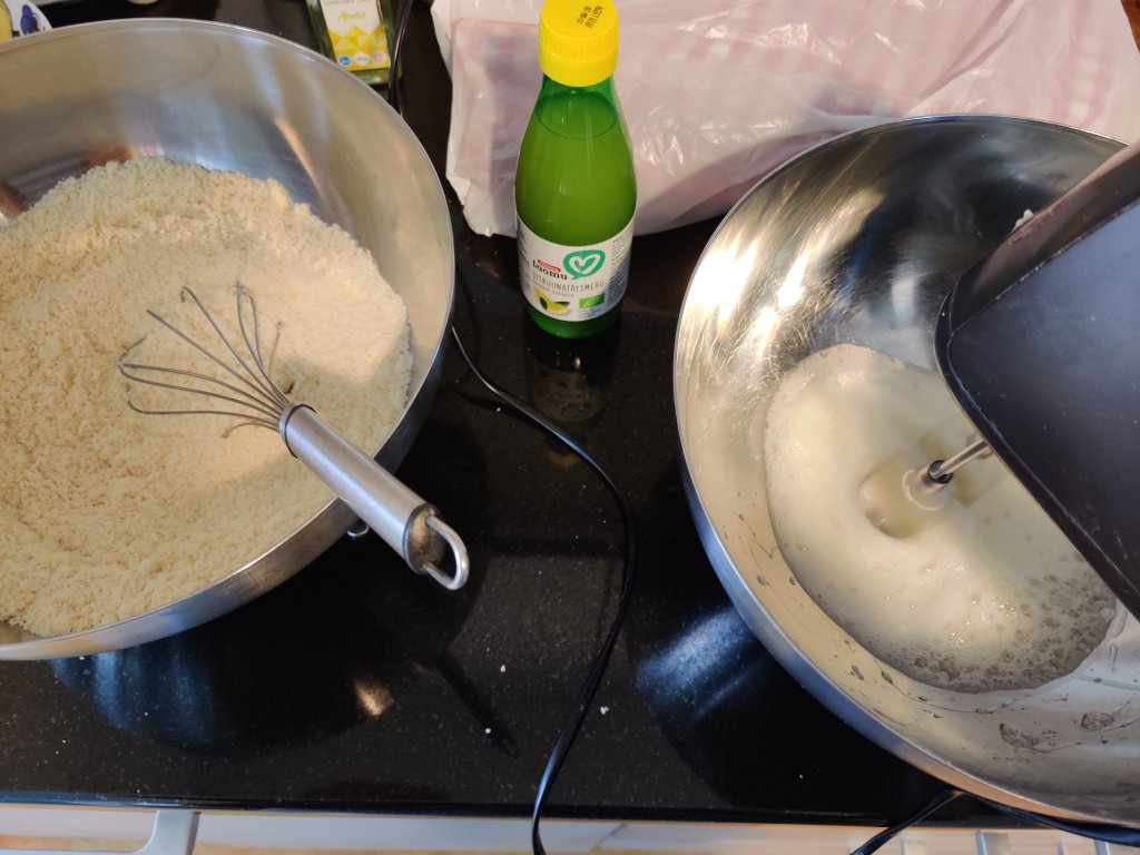 2. Vatkaa valkuaiset kovaksi vaahdoksi, lisää sitruunamehu ja vatkaa taas kovaksi vaahdoksi. (Jos teet autenttisia keksejä unohda sitruunamehu ja lisää valkuaisvaahtoon 10 tippaa karvasmanteliaromia ja 1 rkl amarettoa. Jos käytät jauhoseoksessa 30g karvasmantelia, unohda sitruunamehu ja karvasmanteliaromi ja lisää 1rkl amarettoa.)