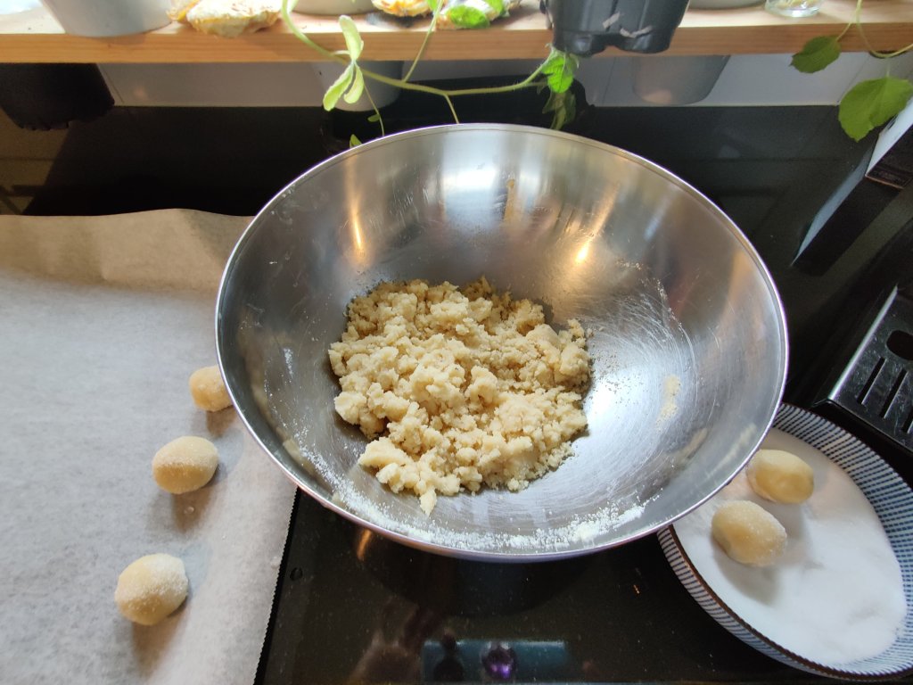 4. Muotoile n. 1rkl massasta vedellä kostutetuin käsin pallo, joka kierittellään vielä sokerissa ennen pellille leivinpaperin päälle laittamista.