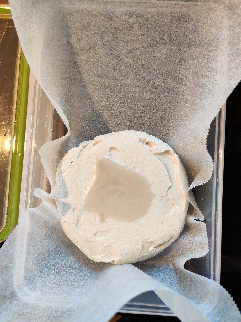 5. Käännä päivittäin juusto ylösalaisin 3 viikon ajan koskematta käsin juustoon (onnistuu helposti leivinpaperin ja kannen avulla). Kun juusto on kauttaaltaan valkohomeen peitossa, voi sen kietoa vahapaperiin ja käännellä 2-3 päivän välein.