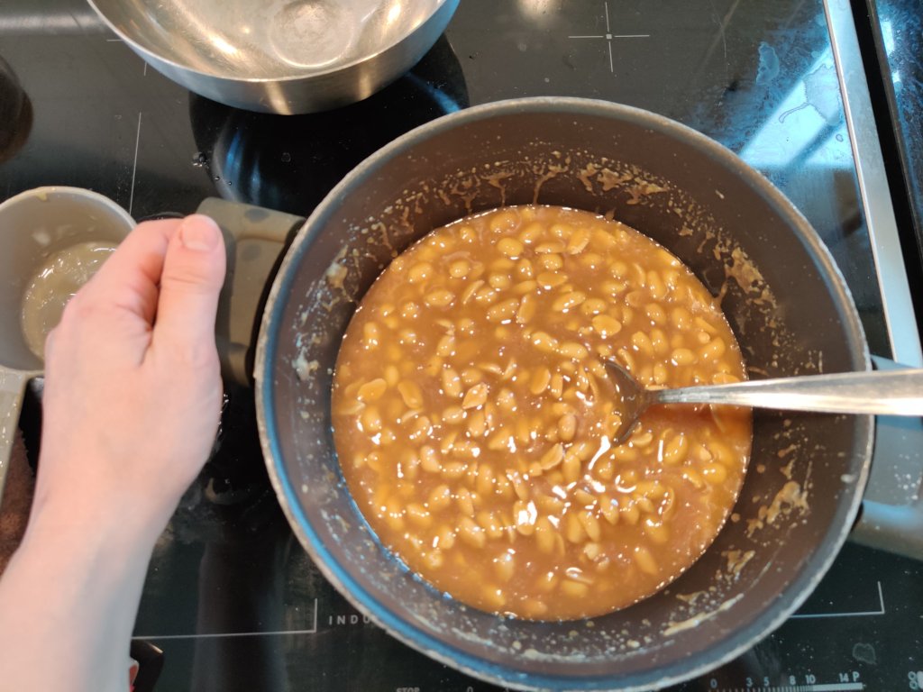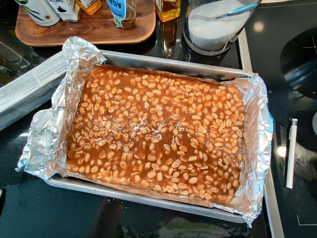 2. Valmista maapähkinäkaramelli: Mittaa kaikki karamellin ainekset ravintohiivahiutaleita ja maapähkinöitä lukuunottamatta teflonkattilaan. Aseta hella keskilämmölle ja keitä n.15 min välillä sekoittaen. Lisää ravintohiiva, sekoita ja jatka keittämistä, kunnes sokerilämpömittarilla seos on +120C (yhteensä meni noin 35min). Lisää maapähkinät, sekoita ja kaada voidellun folion päälle vuokaan. Anna jähmettyä.