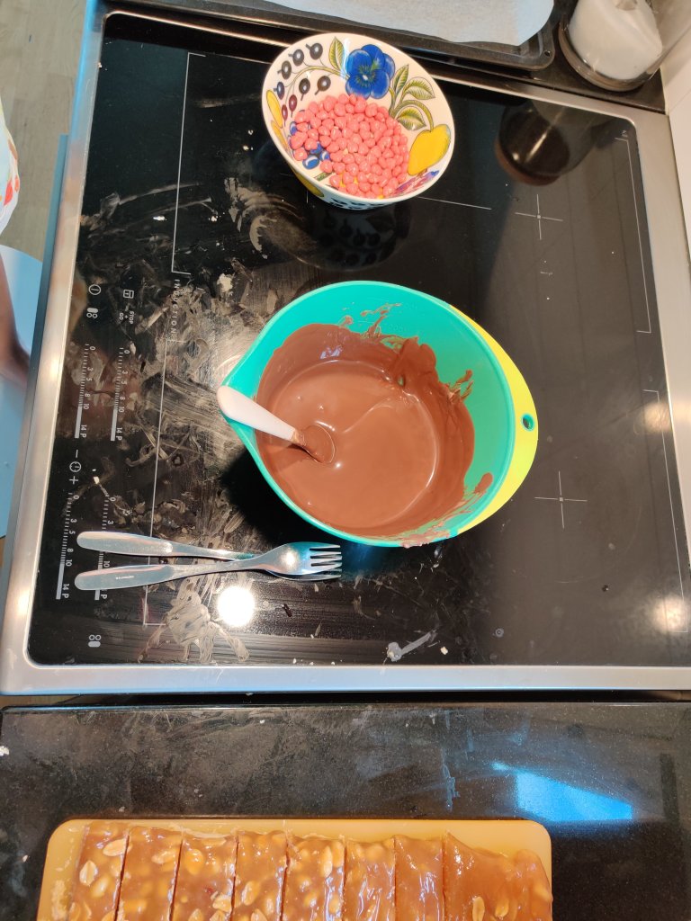 6. Kumoa karkkilevy leikkuulaudalle, irrota folio ja leikkaa terävällä, kiehuvassa vedessä kastellulla veitsellä levy patukoiksi. Minä sain 18 suorakaidetta ja neljä kapeaa ja pitkää palaa. Laita puolet karamellista takaisin jääkaappiin, ettei se ala sulaa huoneenlämmössä. Dppaa loput yksitellen sulassa suklaassa ja nosta leivinpaperin päälle uunipellille jähmettymään. Sulata lisää suklaata, ota loput karamellitangot jääkaapista ja dippaa nekin yksitellen suklaaseen.