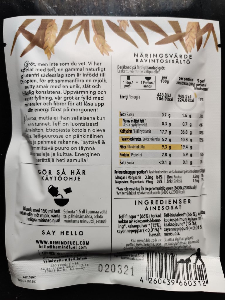 Sen verran kitkerä on teffin luontainen maku, että oli pakko lisätä puuron päälle 2rkl taatelijauhetta, sitten puuro oli hyvää. Tämä toki on makuasia, jollekin toiselle puuro on sopivaa ilman mitään mausteita.