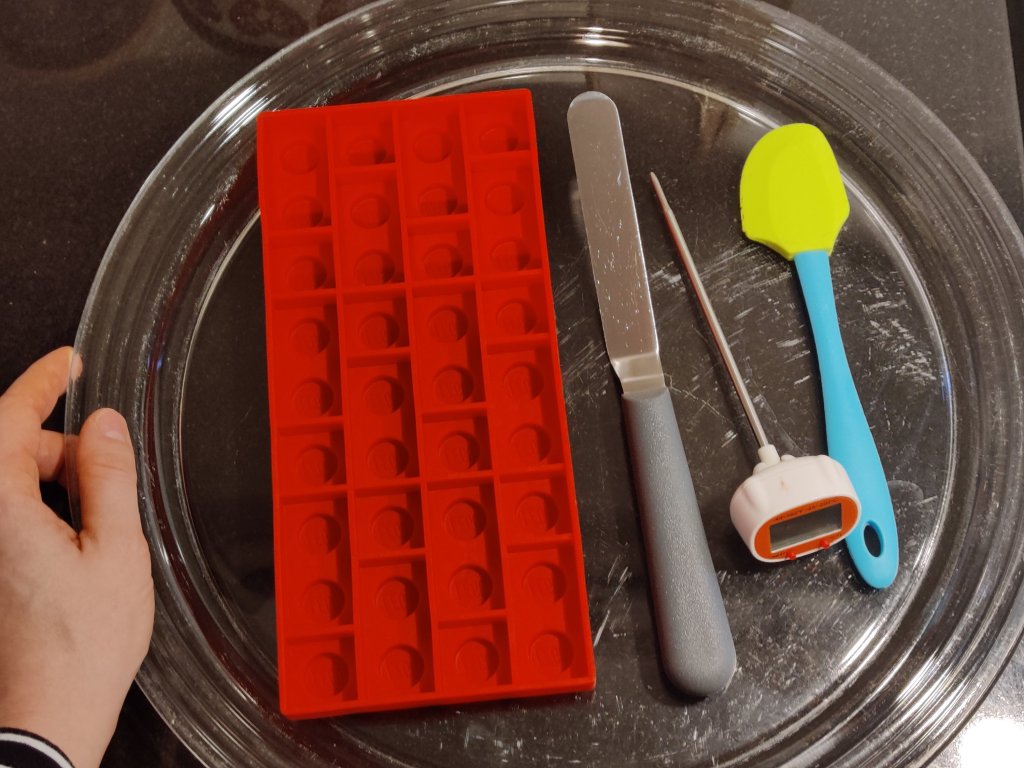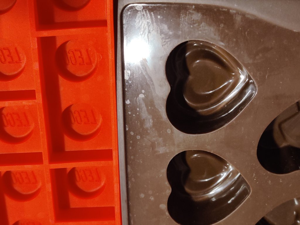 Tänä vuonna käytin muottina silikonista Lego-jääpalamuottia. Koska muottini on mattapintainen ja silikoninen, muodostui konvehtien irrotus muotista ongelmaksi, ja jouduin pakastamaan konvehdit ennen irrotusta. Myös valmiit konvehdit ovat mattapintaisia näistä syistä johtuen. Kovia konvehtimuotteja minulla ei olekaan, ehkäpä toivon joululahjaksi niitä, jotta ensi joulun konvehdit olisivat täydellisiä.